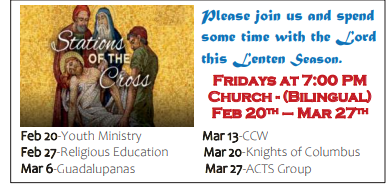 Hora Santa en Español, 2do y 4to jueves del mes - Womens' Nocturnal Adoration, 4th Sat of the month - Men's Nocturnal Adoration, 1st Sat of the month - Eucharistic Adoration in English, 3rd Tue of the month - Familias Unidas en Oración, Mondays 7-9pm - JUDE Grupo Matrimonial, Fridays, 6:30-9pm, JUDE Matrimonial Retiro de Matrimonios, Women's Spanish ACTS Retreat, Men's English ACTS Retreat,